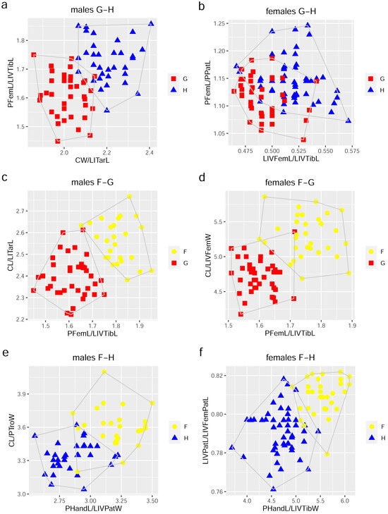 Scatterplots of the first versus the second most discriminating ratios in pairwise comparisons of the mtDNA lineages. (a,c,e) Males; (b,d,f) females. For measurement abbreviations, see Figure S1.