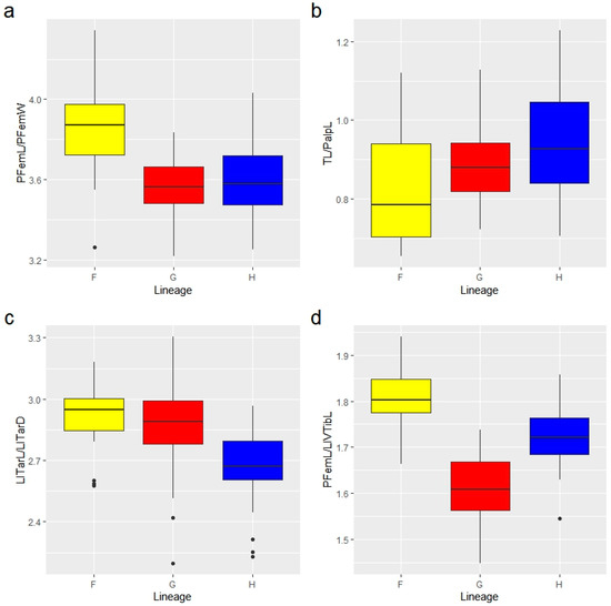 With few exceptions, the best discriminating ratios did not include proportions that were used traditionally in Dactylochelifer taxonomy, e.g., proportions of the palpal femur or male tarsus of leg I, or the relative length of the palpi. The variation in some of these proportions is shown in Figure 7. Specimens of lineage F (both sexes) can be tentatively differentiated by a more slender palpal femur, while in males of lineage H the male foretarsus is stouter on average, but there is overlap in all ratios.
