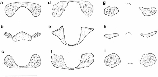 Structure of the cribriform plates in female genitalia. (a–c) Lineage F (Dactylochelifer ninnii); (d–f) Lineage G (D. latreillii); (g–i) Lineage H (D. degeerii). (a,d,g) Frontal view; (b,e,h) dorsal view; (c,f,i) caudal view. Scale 0.1 mm.