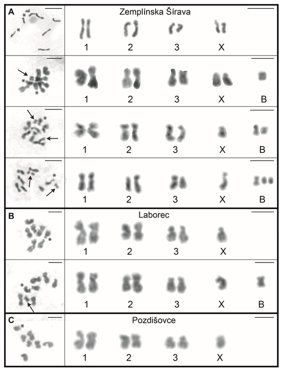 Mitotic metaphases (left panel) and derived karyotypes (right panel) of Acanthocephalus lucii males and females. (A) ZŠ population without and with B chromosomes (2n = 7/8 + 1–3B). (B) LB population without and with B chromosome (2n = 7+1B). (C) PZ population. Asterisks indicate X chromosomes and arrows indicate B chromosomes. Bar = 5 µm.