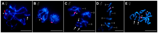 FISH with the 18S rDNA probe (red) on chromosomes of Acanthocephalus lucii. (A) Female pachytene bivalents with one B chromosome at the periphery. (B) Male pachytene and early meiotic prophase I nucleus. (C) Male diplotene with three B chromosomes. (D) Male mitotic metaphase. (E) Female mitotic metaphase with two B chromosomes. Asterisks indicate X chromosomes and arrows indicate B chromosomes. Chromosomes were counterstained with DAPI. Bar = 10 µm.