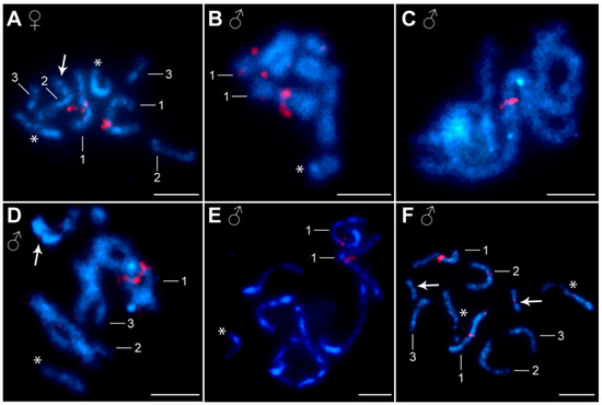 FISH experiments with an 18S rDNA probe showed one cluster of hybridization signals on the X sex chromosome in all three populations. The signals were about equally strong in both sexes. The rDNA locus (i.e., the nucleolar organizer region, NOR) was located on the short arms of the X chromosome in the pericentromeric region (Figure 2). The female chromosome spreads showed one or two clusters of hybridization signals, depending on the degree of chromosome pairing during the pachytene stage (Figure 2A). One cluster of hybridization signals was observed during meiotic prophase I in the male spreads (Figure 2B). At the diplotene stage of the males, the position of rDNA on the single X chromosome was clearly visible (Figure 2C). The activity of NOR was detected via AgNO3 staining. This method showed a compact, large nucleolus through the first meiotic division and a dark band at the sites previously identified using FISH with the 18S rDNA probe (Figure S1J–O). The distribution of H3 histone genes was also similar in all three populations examined. The H3 histone probe showed a single gene cluster on the first chromosome pair (Figure 3A,B). The array of the H3 genes was located on the long arms in the pericentromeric region. During meiotic division, FISH clearly showed a cluster of hybridization signals on a pachytene bivalent (Figure 3C) as well as on both homologous chromosomes #1 in the diplotene (Figure 3D) and in the anaphase I nuclei (Figure 3E,F).