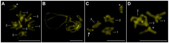 The chromomycin A3 (CMA3) fluorochrome indicates the presence of GC-rich heterochromatin. CMA3-positive bands were observed at the ends of all chromosomes in all three populations (Figure 4). The fluorescent bands were more prominent in the metaphase and diplotene nuclei (Figure 4A,C,D) than in the pachytene nuclei (Figure 4B). In the ZŠ and LB populations, the signals were also present on the B chromosomes (Figure 4C). We did not observe pronounced DAPI-positive bands (AT-rich heterochromatin blocks) on either the A chromosomes or the B chromosomes; only weak centromeric heterochromatin bands were detected on the A chromosomes of all three populations (Figure 2 and Figure 3).