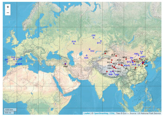 Map of geographic distribution of Artemia populations. Red circles represent populations sampled in this study, and blue circles represent sequences retrieved from NCBI. Detailed information is listed in Table 1.