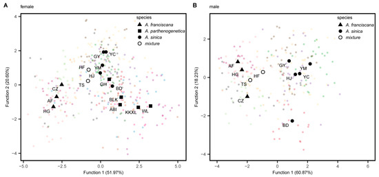 Scatterplot of the first two functions obtained from the discriminant analysis of Artemia (A) females and (B) males using 14 morphological parameters. The colored dots represent individuals from each population. The abbreviations for populations are explained in Table 1. ▲ represents the centroid of A. franciscana populations, ■ represents the centroid of A. parthenogenetica populations, ● represents the centroid of A. sinica populations and ○ represents the centroid of populations with mixed species.