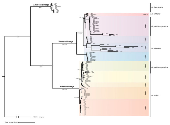 The phylogenetic trees generated by means of ML and BI showed consistent topologies with three distinct and well-supported clades (the American Lineage, Eastern Lineage and Western Lineage; Figure 5). The American Lineage was composed of A. franciscana from the Bohai Bay (CZ, HF, HG and TS). The samples from Eurasia were split into two lineages: the Eastern and Western Lineages. The Eastern Lineage had two well-defined clades, including A. sinica from China, and partially parthenogenetic individuals from Europe, Iran, the QTP, the Tsaidam Basin, Xinjiang and the Bohai Bay. A. sinica that originated mainly from North China (Clade 1) and the Ordos Basin in Inner Mongolia (Clade 2) clustered in a group at the base of the Eastern Lineage. The other samples were split into three groups, including bisexual populations from the Tsaidam Basin (Clade 3), bisexual populations from the Alxa area (Clade 4) and parthenogenetic populations (Clade 5). However, the parthenogenetic samples in the Eastern Lineage did not form a monophyletic group. The A. parthenogenetica haplotypes (H40 and H41) from Lake Urmia, Iran, clustered within the BD group, forming a sister branch to all the other parthenogenetic specimens in the Eastern Lineage.