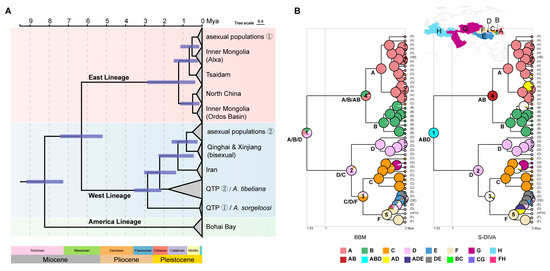 (A) A chronogram of the divergence time of Artemia lineages constructed under a relaxed clock model using BEAST. Time is indicated in million years (Ma). Blue horizontal bars represent 95% HPD. (B) Ancestral distributions of Artemia in the Eastern Lineage were reconstructed by means of RASP based on BBM and the S-DIVA model. The distribution areas of Artemia are marked in capital letters A–H (A: North China including the North China Plain and central Inner Mongolia; B: the Ordos Basin in Inner Mongolia; C: Alxa area in Inner Mongolia including the Badanjilin Desert; D: Tsaidam Basin; E: Qinghai–Tibet Plateau (QTP); F: Xinjiang; G: Central and Western Asia; H: the Mediterranean).