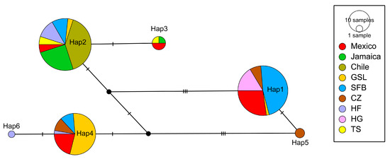 All A. franciscana sequences from the Bohai Bay and the American continent were composed of six haplotypes (Figure 7). Hap1, Hap2 and Hap4 were the most abundant haplotypes, with a share of 34.4%, 37.5% and 23.8%, respectively. Hap1 was mainly composed of samples from the San Francisco Bay (SFB) in the USA (47.3%) and Mexico (27.3%,), and all samples from the HG population were distributed in Hap1. Hap2 was mainly composed of samples from Chile (40%) and Jamaica (25%), with over 70% of the samples from the TS and HF populations distributed in this haplotype. Hap4 included samples from the Great Salt Lake (GSL) in the USA (55.3%) and Mexico (21.1%). The CZ and HF populations had their distinct haplotypes, H5 and H6, respectively.