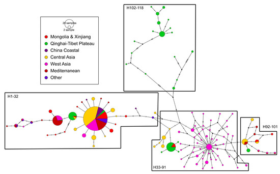 The Western Lineage presented 118 haplotypes within the 667 individuals (Figure 9), which could be gathered into four groups. Group 1 (Hap1–32) was composed of parthenogenetic populations from Asia (including China, Kazakhstan, Russia, Iran, Pakistan, Ukraine, Israel and India), the Mediterranean (including southern Europe and northern Africa) and other locations in southern Africa (HM998995, Swakopmund, Namibia) and eastern Africa (HM998999, Ankiembe, Madagascar). These parthenogenetic populations shared a major haplotype among 43.03% of the total individuals. Group 2 (Hap33–91) was composed of bisexual populations from Iran (A. urmiana), QTP (XH, YSH and JYH populations) and Kazakhstan. Group 3 (Hap92–101) was also composed of parthenogenetic populations from inland China, Central and Western Asia, and the Mediterranean. These three haplotype groups were connected by one or two mutations, while group 4 (Hap102–118), which was formed by samples from the LGC, GLC and QXC populations, was genetically distant from them.