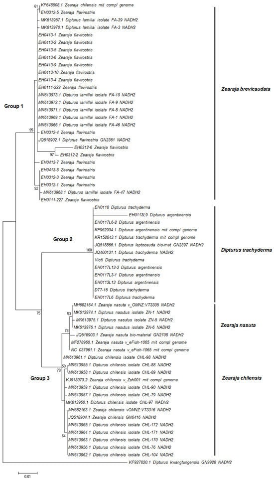 - Vargas-Caro, C.; Bustamante, C.; Lamilla, J.; Bennett, M.B.; Ovenden, J.R. The phylogenetic position of the roughskin skate Dipturus trachyderma (Krefft & Stehmann, 1975) (Rajiformes, Rajidae) inferred from the mitochondrial genome. Mitochondr. DNA 2016, 27, 2965–2966. [Google Scholar]