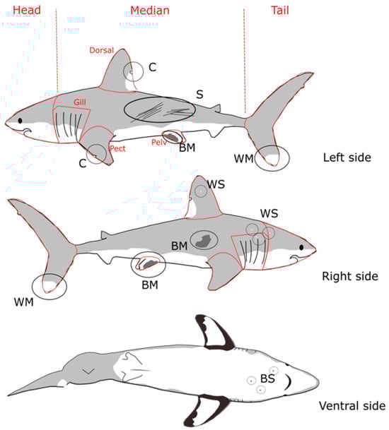 - Domeier, M.L. Global Perspectives on the Biology and Life History of the White Shark; CRC Press: Boca Raton, FL, USA, 2012. [Google Scholar]