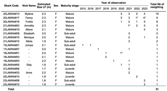 APA StyleJung, A., Ory, A., Abaut, P., & Zaccagnini, L. (2024). First Use of Free-Diving Photo-Identification of Porbeagle Shark (Lamna nasus) off the Brittany Coast, France. Diversity, 16(3), 155. https://doi.org/10.3390/d16030155