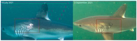 - Anderson, S.D.; Chapple, T.K.; Jorgensen, S.J.; Klimley, A.P.; Block, B.A. Long-term individual identification and site fidelity of white sharks, Carcharodon carcharias, off California using dorsal fins. Mar. Biol. 2011, 158, 1233–1237. [Google Scholar] [CrossRef]