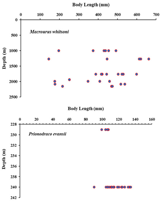 Relationship between body length and depth distribution of M. whitsoni and P. evansii.
