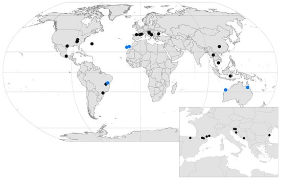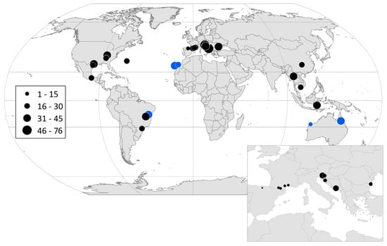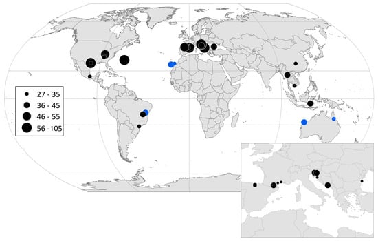 Global map of subterranean hotspots, where the dots are proportional to the number of species (see Table 2, column S+T). Horizontal lines are the Equator, ±23.5° (Tropic of Cancer and Tropic of Capricorn, and Arctic and Antarctic Circles (±66.5°). Non-karst sites are shown in blue and karst sites are shown in black. The inset map of the Mediterranean region provides greater resolution. Map courtesy of Magdalena Năpăruş-Aljančič.