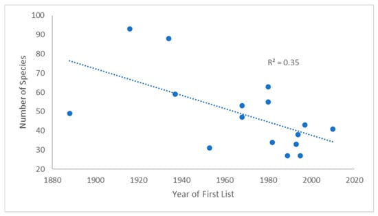 As is to be expected with a rare, elusive fauna, sampling for the majority (if not all) of the sites listed in Table 2 is incomplete, and the extent of incompleteness varies among sites. A few sites, most notably Postojna Planina Cave System (Slovenia), Vjetrenica Cave System (Bosnia and Hercegovina), and Mammoth Cave (USA) have a centuries-old history of biological study. Others, especially those in the tropics and subtropics, have a decade long or less history of biological study. Lukić et al. [] reported that almost all information for the fauna of the Lukina Jama-Trojama Cave System in Croatia dates from the 1990s or later. The same is true for Fern Cave in Alabama [], Hon Chong in Vietnam [], and the Água Clara Cave System in Brazil [,]. Sampling effort is therefore a major determinant of the richness of species in these caves. We estimated sampling effort by comparing numbers of species with the date of the first listing of the fauna. Other measures, such as total number of publications, are difficult to estimate due to difficulties in defining publication about the site, for example, does it include monographic taxonomic studies where the species in question are a small part of the study? When date of first faunal list and number of species are compared, the regression accounts for approximately one-third of the total variance in species number (Figure 4). This gives pause to more biological interpretations (see below).