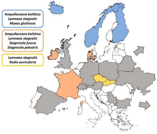 Map showing records of Plagiorchis spp. in Europe based on Host–parasite Database of the Natural History Museum, London [50] and the literature data. Countries marked in color indicate records from molecular studies (DNA sequences available); sub-Arctic regions in blue, Central Europe in yellow and Western Europe in pink, with the snail hosts indicated for each region. Countries marked in grey indicate records based solely on morphological identification of cercariae; the grey arrows represent European Russia and Georgia. See Supplementary Table S1 for details.