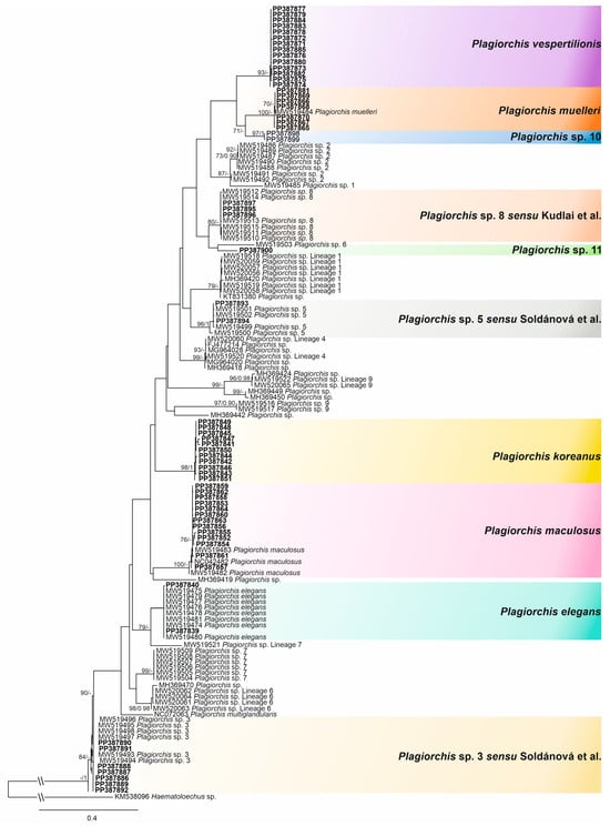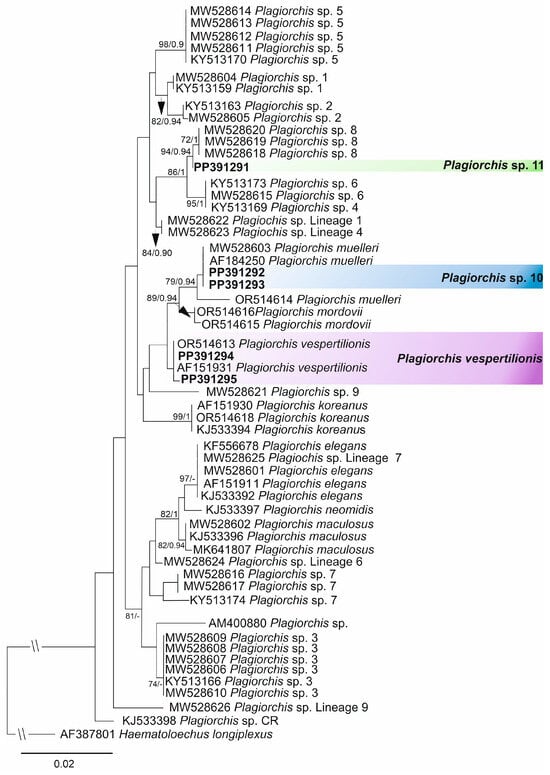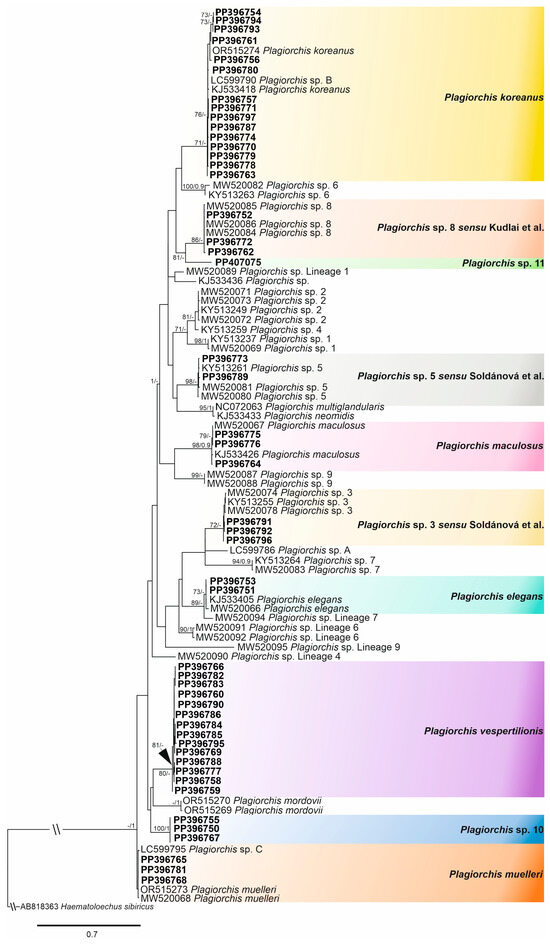 The phylogenetic tree resulted from maximum likelihood (ML) analysis of the 28S sequences datasets of Plagiorchis spp. with nodal support values shown at the node as ML/BI (Bayesian inference). Support values < 70 (ML) and 0.90 (BI) are not shown. Sequences generated in the present study are highlighted in bold.
