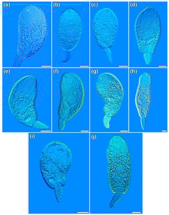 Plagiorchis spp., photomicrographs of live cercariae: (a) P. elegans; (b) P. koreanus; (c) P. maculosus; (d) P. muelleri; (e) P. vespertilionis; (f) Plagiorchis sp. 3 sensu Soldánová et al. [17]; (g) Plagiorchis sp. 5 sensu Soldánová et al. [17]; (h) Plagiorchis sp. 8 sensu Kudlai et al. [6]; (i) Plagiorchis sp. 10 (present study); (j) Plagiorchis sp. 11 (present study). Scale-bars: 50 μm.