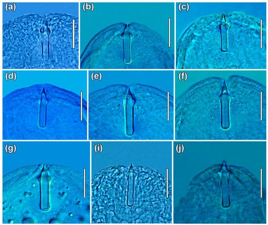 Plagiorchis spp., photomicrographs of stylets of live cercariae: (a) P. elegans; (b) P. koreanus; (c) P. maculosus; (d) P. muelleri; (e) P. vespertilionis; (f) Plagiorchis sp. 3 sensu Soldánová et al. [17]; (g) Plagiorchis sp. 5 sensu Soldánová et al. [17]; (i) Plagiorchis sp. 10 (present study); (j) Plagiorchis sp. 11 (present study). Representative photomicrograph of the stylet of Plagiorchis sp. 8 sensu Kudlai et al. [6] (h) was not obtained. Scale-bars: 20 μm.