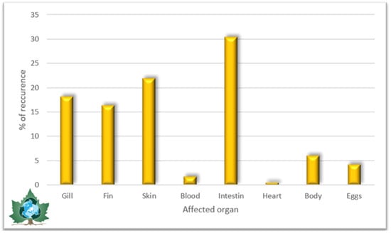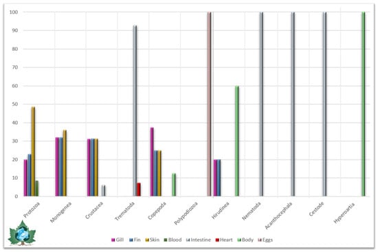 Considering the extent of infestation manifested by various organs of sturgeons in accordance with each taxonomic group of parasites, the scientific literature provides the subsequent data, also presented in the chart in Figure 3: