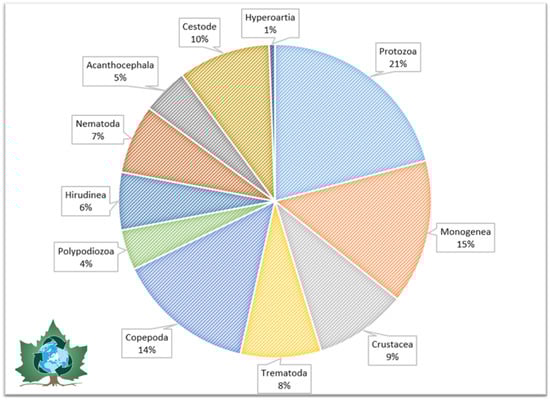 Figure 2 shows that the majority of identifications in the studies have been attributed to protozoa (21%), followed by monogeneans (15%), copepods (14%), cestodes (10%), crustaceans (9%), trematodes (8%), nematodes (7%), hirudines (6%), acanthocephalans (5%), and polypodiozoa (4%). The Hyperoartia group is recorded as having the lowest percentage of identified infestations, at 1%. However, these statistics do not reflect the real in situ scenario, where percentages can vary substantially; rather, they indicate the level of parasite identification based on the literature.