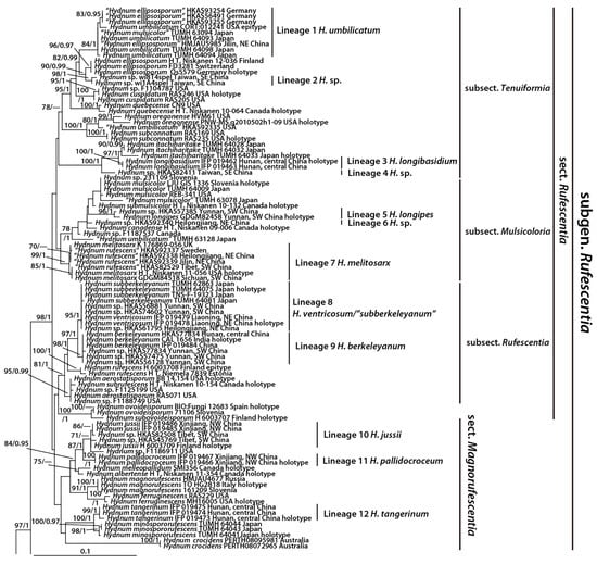 When Linnaeus established Hydnum in 1753, it included all species of mushroom-forming fungi with a spinose hymenophore [1,9]. Molecular phylogenetic analyses suggested that spinose hymenophore has independently evolved many times in distant taxa [13]; thus, many species previously included in Hydnum have been moved to other genera, such as Hericium Pers., Phellodon P. Karst., Sarcodon Quél. ex P. Karst. [14]. Up to now, Hydnum s.s. has been divided into five subgenera: Alba Niskanen & Liimat., Brevispina T. Cao & H. S. Yuan, Hydnum L., Pallida Niskanen & Liimat., and Rufescentia Niskanen & Liimat. [1,15]. Within subg. Hydnum, two sections, viz. Hydnum L. and Olympica Niskanen & Liimat. are included; subg. Rufescentia also includes two sections: Magnorufescentia Niskanen & Liimat. and Rufescentia Niskanen & Liimat; sect. Rufescentia currently includes three subsections: Mulsicoloria Niskanen & Liimat., Rufescentia Niskanen & Liimat., and Tenuiformia Niskanen & Liimat. [1].