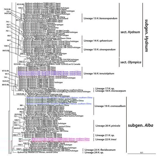 - Feng, B.; Wang, X.H.; Ratkowsky, D.; Gates, G.; Lee, S.S.; Grebenc, T.; Yang, Z.L. Multilocus phylogenetic analyses reveal unexpected abundant diversity and significant disjunct distribution pattern of the Hedgehog Mushrooms (Hydnum L.). Sci. Rep. 2016, 6, 25586. [Google Scholar] [CrossRef] [PubMed]
