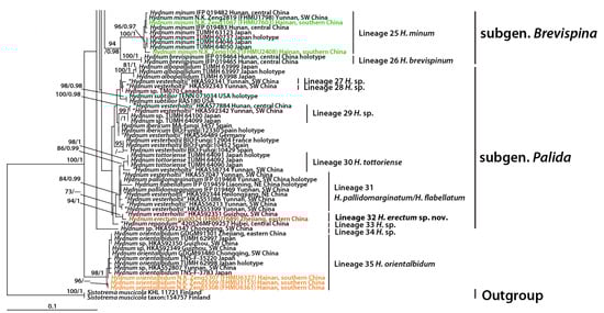 Existing molecular data indicated that the Chinese collections of Hydnum were grouped into 35 isolated lineages (Figure 1). A total of six lineages (16, 19, 22, 25, 32, and 35), including our new specimens, were identified. Lineage 16, with strong statistical support (BS = 97%, PP = 0.99), was comprised of the holotype (IFP 019476) and one specimen (IFP 019477) of H. tenuistipitum T. Cao & H.S. Yuan, three new collections (FHMU7644, FHMU7636, and FHMU7642) from central China, and three unidentified collections (HKAS56789, HKAS55327, and HKAS93261); lineage 19, with high statistical support (BS = 81%, PP = 0.99), included the holotype (TUMH 60740) of H. cremeoalbum Liimat. & Niskanen, two new specimens (FHMU2404 and FHMU1631) from southern China, four collections (HKAS92345, TUMH 64026, TUMH 64019, and TUMH 64024) identified as H. cremeoalbum, two specimens (IFP 019480 and IFP 019481) identified as H. albomagnum Banker, and one unidentified collection (HKAS93258) from southern China; lineage 22, with high statistical support (BS = 92%, PP = 1), was comprised of the holotype (TU110403) of H. treui Tedersoo, Liimat. & Niskanen, and two new collections (FHMU7690 and FHMU7691) from southern China; lineage 25, with strong statistical support (BS = 100%, PP = 1), included the holotype (TUMH 60737) and six collections (TUMH 63123, TUMH 64046, TUMH 64050, IFP 019482, FHMU1798, and IFP 019483) of H. minus Yanaga & N. Maek, and two new specimens (FHMU7603 and FHMU2408) from southern China; lineage 32, with high statistical support (BS = 94%, PP = 1), included one new specimen (FHMU7689) from eastern China, and one collection (HKAS92351) identified as H. vesterholtii; lineage 35, with strong statistical support (BS = 98%, PP = 1), included the holotype (TUMH 62998) and three specimens (TNS-F-35220, TNS-F-3783, and TUMH 62997) of H. orientalbidum R. Sugaw. & N. Endo, three new collections (FHMU6327, FHMU3153, and FHMU6361) from southern China, and three unidentified collections (HKAS52807, HKAS92350, and HKAS92349) from China (Figure 1).