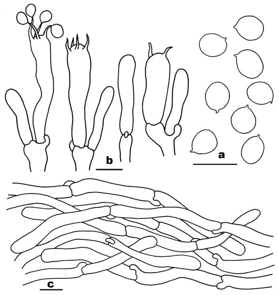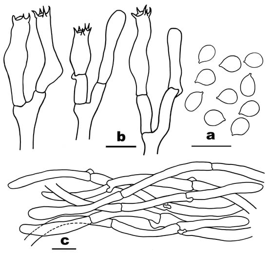 Microscopic features of Hydnum minus (FHMU2408). (a) Basidiospores. (b) Basidia. (c) Pileipellis. Scale bars = 10 μm. Drawings by Y.Z. Zhang.