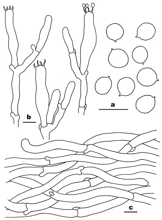 Microscopic features of Hydnum cremeoalbum (FHMU1631). (a) Basidiospores. (b) Basidia. (c) Pileipellis. Scale bars = 10 μm. Drawings by Y.Z. Zhang.