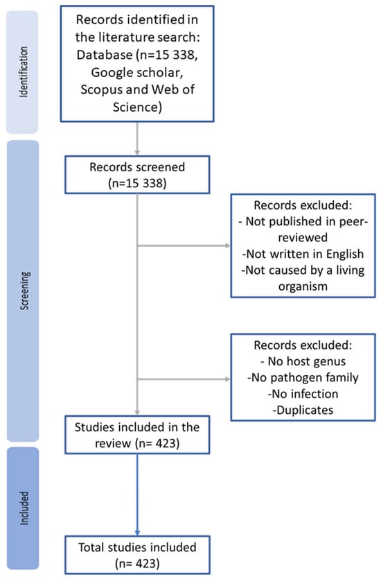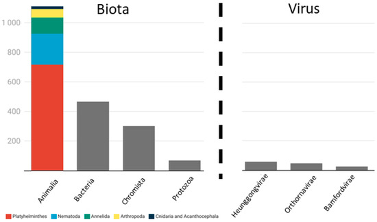 A total of 2101 infections were reported, and across all agents, more than half belonged to Animalia (n = 1113) (Figure 5). Similarly, in their meta-analyses on the relationship between host body condition and parasite infection, Sánchez et al. [51] found that the majority of the parasites were from Animalia. On the contrary, in their review of long-term studies in wildlife diseases, Barroso et al. [18] identified viruses and bacteria as major pathogens. One of the differences between the above-described papers is the fact that Sánchez et al. [51] used a combination of (parisit*OR infect* OR disease*), and Barroso et al. [18] used ‘disease’ as a search word for the whole literature search. In our review, the number of papers increased from 219 to 423 when we removed the word ‘disease’ before ‘parasite’ and ‘protozoa’. These results referred, almost exclusively, to animal parasites, many of them not identified in the literature search performed before removing the word ‘disease’. According to Foufopoulos et al. [52], all disease-causing agents can be classified as parasites. On the other hand, pathogens are a subset of microparasites such as bacteria and viruses that have substantial detrimental effects on the hosts. The word ‘disease’ is more closely associated with pathogens than with other parasites, like leeches and ticks, which are often considered primarily in their role as vectors of diseases. Nevertheless, many microorganisms naturally form part of the healthy microbiome of the hosts as commensals or mutualists but do not cause any disease. Therefore, it is extremely important to refine and adapt search words, so that information from all spectra of infectious agents can be gathered in reviews. We propose that in the case of bacteria, viruses, and fungi, the word ‘disease’ should be added to the literature search to exclude papers that only describe the healthy/normal microbiome. On the other hand, when searching for parasites and protozoa, the word ‘disease’ should be excluded as a search word to make sure that all types of parasites are included in the review.