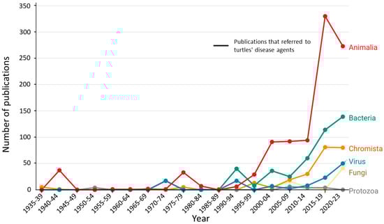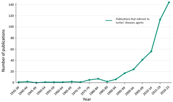 Yearly distribution of publications involving disease agents in freshwater turtles.