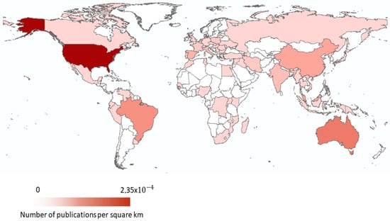 World distribution of publications. The darker red represents a higher number of publications per square kilometer and the lighter red represents a lower number of publications per square kilometer. White-coloured countries did not have any publications.