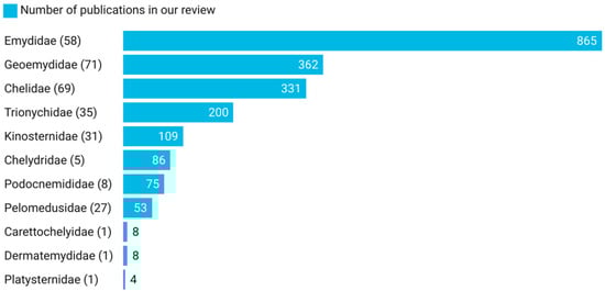 Of the 14 Testudines families [1,2,26], 11 families were present in this review, meaning that at least one member of each of these 11 families of freshwater turtles was present and that this review covered a significant diversity of the freshwater chelonian families [1]. When compared with other reptile groups, turtles have a higher number of published studies per species, and in general, the number of studies is positively associated with the species’ body mass and negatively associated with the year of the species description [25]. In our review, the most mentioned family was Emydidae (n = 865), while the least mentioned were Carettochelyidae (n = 8), Dermatemydidae (n = 8), and Platysternidae (n = 4) (Figure 4). Although the least mentioned families were those with the lowest number of described species [1,2,25] and there is a clear trend towards more references of disease agents associated with more species-diverse host families, there are exceptions. Following Uetz et al. [2], the most species-diverse family is Geoemydidae (71 species), followed by Chelidae (69 species), and then by Emydidae (58 species). In this review, the Emydidae family was mentioned 855 times, and the species with the greatest contributions were Trachemys scripta (Thunberg in Schoepff, 1792) (n = 313) and Emys orbicularis (Linnaeus, 1758) (n = 169) (Supplementary Materials S2). Trachemys scripta has been introduced in all continents (except for Antarctica) due to the pet trade [27], as well as trade for human consumption and religious reasons [28], and is often considered the most widely invasive reptile species in the world [29]. Host-switching of flatworm endoparasites from introduced T. scripta to native Mauremys leprosa (Schweigger, 1812) has already been identified in natural environments in the Mediterranean region [30]. Moreover, Demkowska-Kutrzepa et al. [31] identified that the helminth parasites co-introduced with T. scripta also infected M. leprosa and E. orbicularis. The increasing human contact with T. scripta and the knowledge that T. scripta transmits their parasites to native species [27] may explain the high number of publications that focus on their diseases. This review included 12 studies that show parasites that have been shared, or that have the potential to be shared, by T. scripta and native species such as E. orbicularis and M. leprosa (e.g., [32,33]). All but one study that referred to E. orbicularis were published after 2003, which may be due to the implementation of the Habitats Directive, which may have lagged in some countries [34,35]. Guedes et al. [25] also identified a positive association between IUCN threat status and the number of reptile studies. Nevertheless, E. orbicularis is not classified with any kind of threat status by the IUCN. The species E. orbicularis is one of the most widespread freshwater turtle species [36], which may also affect the number of published studies. The second most cited family was Geomydidae (Figure 4), in which the main contributors were species of the genus Mauremys (n = 155) (Supplementary Materials S2). This genus has a Palaearctic distribution [1], which includes 2 of the 3 continents with the largest number of studies (Europe and Asia). The family Chelidae is the third most represented family in our review (Figure 4), which, according to Uetz et al. [2], is the third most diverse family.