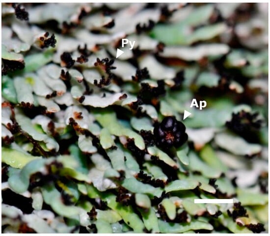 Cetradonia linearis overall habit showing the squamules comprising the main body of the lichen (green and white), sexual reproductive structures called apothecia (Ap), and asexual reproductive structures called pycnidia (Py). The scale bar in the bottom right corner is 3 mm long.
