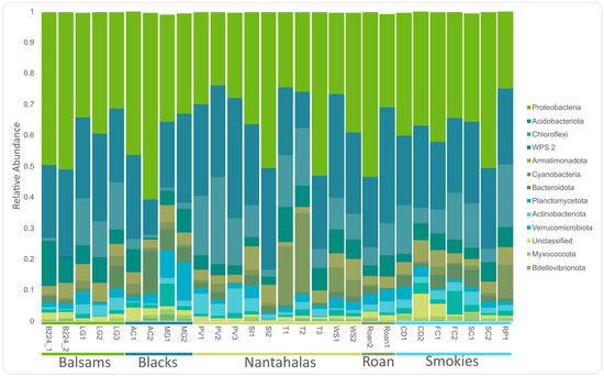 Relative abundances of bacterial phyla with >0.1% mean abundance per sample and samples organized according to mountain range. All lineages with <0.1% relative abundances were removed from the dataset.