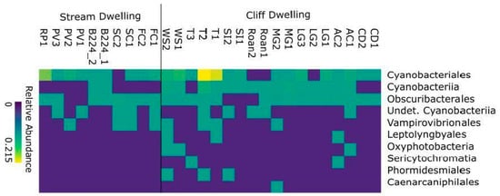 Relative abundance of Cyanobacterial orders in sampled individuals. Abundances range from zero (dark purple) to 0.214 (bright yellow).