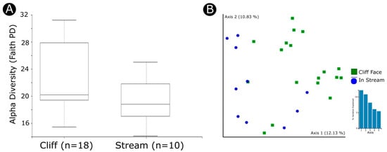 Habitat strongly shapes bacterial diversity and community structure. (A) Bacterial communities in cliff-dwelling individuals were more diverse than those in streams (cliff n = 18, stream n = 10, Kruskal-Wallis, p-value = 0.049). (B) Bacterial communities in each habitat type were significantly different from each other (PERMANOVA, p-value = 0.001).