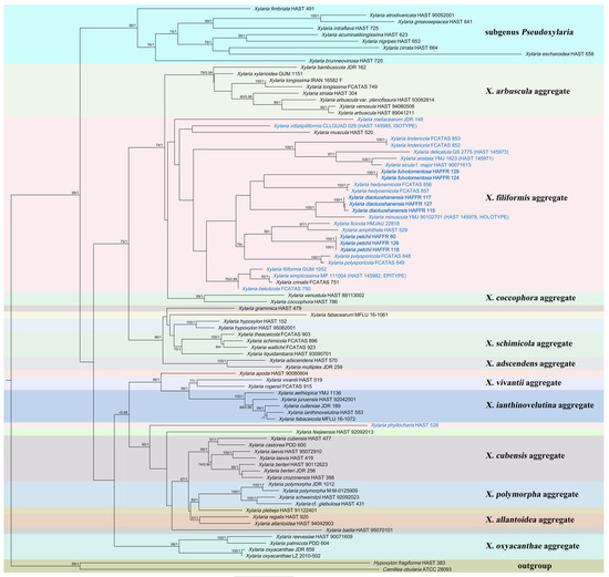The ML phylogenetic tree of Xylaria constructed with ITS-β-tubulin-RPB2 sequences. Support values of ML and BI analyses (bootstrap supports ≥ 70% and posterior probability values ≥ 0.95) are indicated above or below the branches. Species related to fallen leaves and petioles are in blue, and those described in this article are in bold.