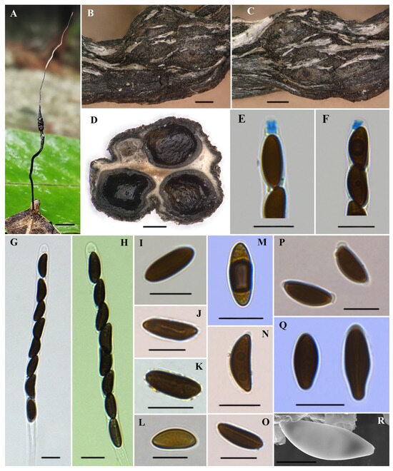 Xylaria diaoluoshanensis (HAFFR 117). (A) Stromata on leaves; (B,C) stromatal surface and ostioles; (D) section through stroma, showing perithecia; (E,F) ascal apical apparatus in Melzer’s reagent; (G,H) asci in 1% SDS; (I,L,M,Q) ascospores in Melzer’s reagent; (J) ascospore in 1% SDS, with a slightly curved germ slit along almost half of the spore-length; (K) ascospore in water; (N) ascospore in 1% SDS; (O) ascospore in 1% SDS, with nearly spore-length germ slit; (P) ascospores in 1% SDS, presenting non-cellular appendages; (R) ascospore under SEM; scale bars: (A) = 0.5 cm; (B–D) = 200 µm; (E–Q) = 10 µm; (R) = 5 µm.