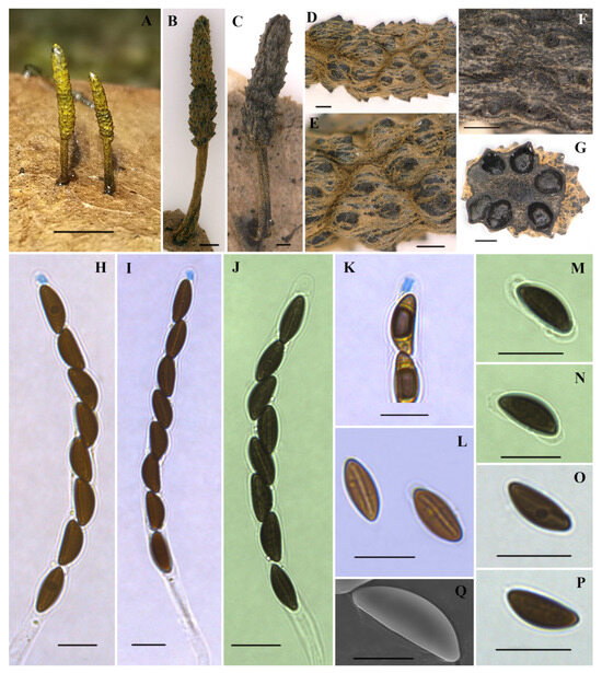 Xylaria petchii (HAFFR 118). (A,B) Stromata on leaves ((B), HAFFR 57); (C) stromata on branches (HAFFR 60); (D) stromatal surface; (E) ostioles; (F,G) section through stroma, showing perithecia; (H) ascal apical apparatus in Melzer’s reagent; (I,J) asci with apical apparatus in Melzer’s reagent; (K) asci in water; (L) ascospores in 1% SDS, presenting non-cellular appendages; (M) ascospores in Melzer’s reagent; (N) ascospore with a spore-length germ slit in water; (O) ascospore in water; (P) ascospore in Melzer’s reagent, showing a slightly sigmoid germ slit; (Q) ascospore under SEM; scale bars: (A–C) = 0.5 cm; (D–G) = 200 µm; (H,I,L–P) = 10 µm; (J,K) = 25 µm; (O) = 5 µm.