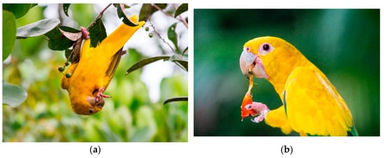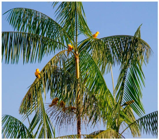 The Golden Parakeet (Guaruba guarouba) is an exuberant parrot endemic to the Brazilian Amazon Rainforest. Its lush plumage has the green and yellow colors of the national flag, making it a prime candidate for the Brazilian national bird []. The species has suffered dramatically from the illegal pet trade, and with most of its wild population distributed across the most threatened areas in the Amazon, it is listed as vulnerable to extinction [,]. Few authors have thoroughly studied the species despite its symbolic importance and concerning status. Oren and Novaes [] described the parakeets’ biology, while Silveira and Belmonte [] provided information on their reproductive behavior. Laranjeiras [] and Laranjeiras and Cohn-Haft [] described the known geographic distribution of the species and estimated its population size. However, no study has focused on its diet and feeding ecology, which are mostly known from opportunistic observations.
