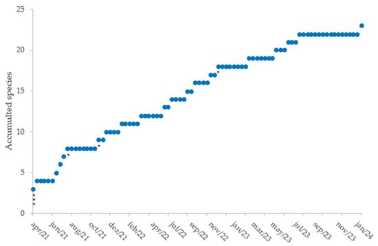 Plant species accumulation curve in the diet of reintroduced Golden Parakeets, as documented during post-release monitoring campaigns. Each asterisk (*) refer to the first time a plant species provided in food training was used in the wild.