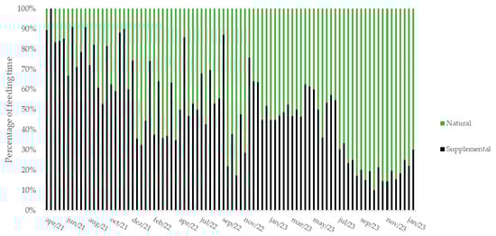 Percentage of time that the group of released parakeets spent feeding in the wild (Natural) or at suspended feeders (Supplemental) throughout the monitoring period.