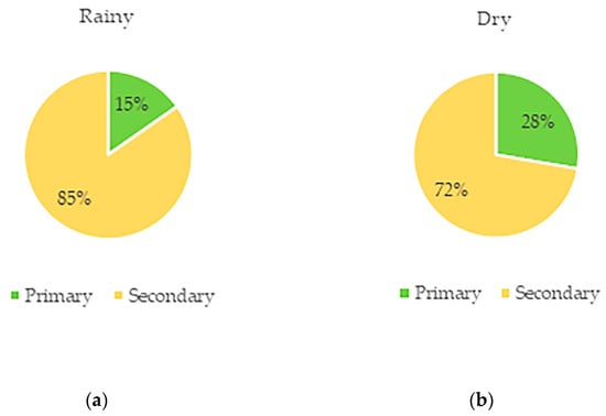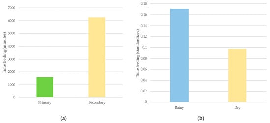 (a) Relative distribution of parakeets’ feeding time during the rainy season between primary and secondary vegetation. (b) Relative distribution of their feeding time during the dry season between primary and secondary vegetation physiognomies.