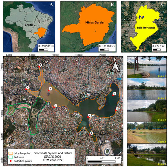 - IGAM—Boletim de Qualidade da Água 2018 a 2022—Sub Bacia do Ribeirão Pampulha: Belo Horizonte: Igam, Mar. 2023. Available online: http://www.repositorioigam.meioambiente.mg.gov.br/jspui/handle/123456789/4298 (accessed on 1 December 2023).