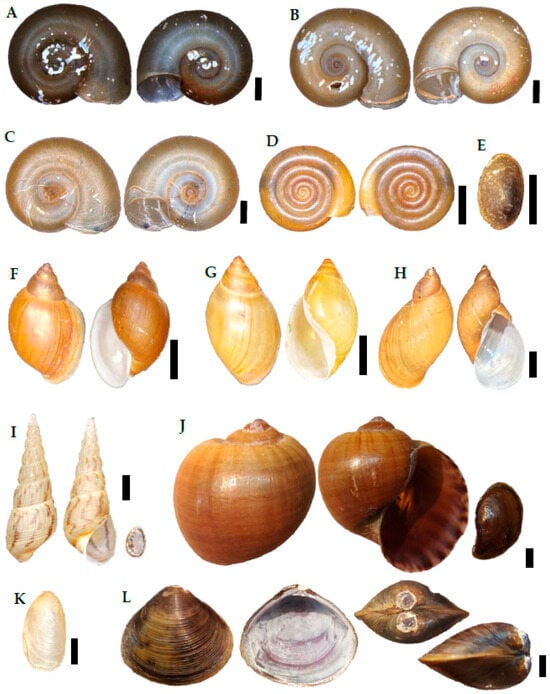 - Cuezzo, M.G.; Gregoric, D.E.G.; Pointier, J.P.; Vázquez, A.A.; Ituarte, C.; Mansur, M.C.D.; Oliveira Arruda, J.; Barker, G.M.; dos Santos, S.B.; Ovando, X.M.C.; et al. Phylum Mollusca. In Thorp and Covich’s Freshwater Invertebrates; Academic Press: Cambridge, MA, USA, 2020; pp. 261–430. [Google Scholar]