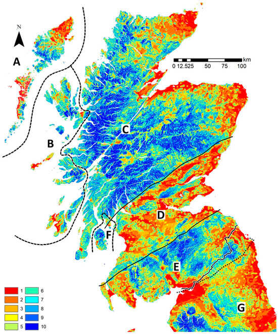 GET model predictions of terrestrial habitat suitability (1–10: ≥6 indicating preference) in Scotland and northern England. The backdrop shows seven regions (A–G), three geological boundary faults, and the political border between Scotland and England, described in Figure 1. Contains Ordnance Survey data © Crown copyright and database right 2020.