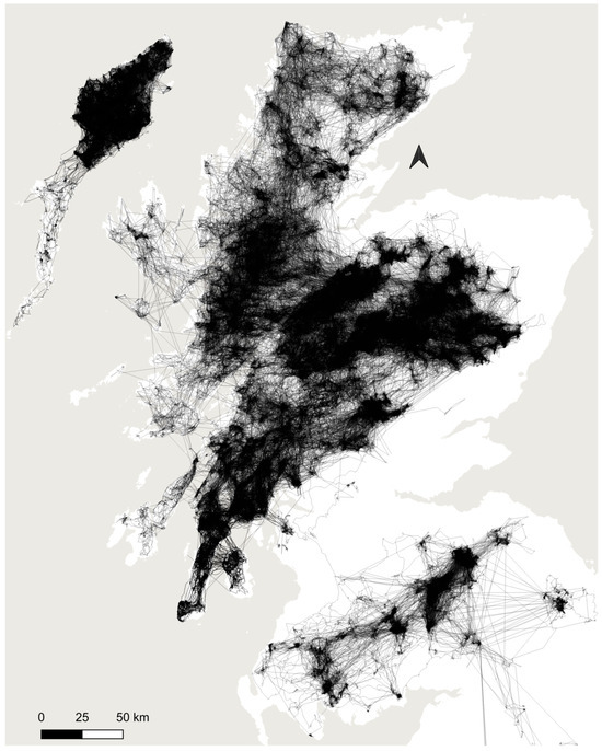 The movements of satellite-tagged birds during natal (juvenile) dispersal within Scotland and northern England are shown in Figure 3. Superficially, but confirming the predictive capacity of the GET model [3], there was broad agreement between the records of dispersing birds (Figure 3) and the GET model’s preferred habitats (Figure 2, see also Appendix A in [29]).